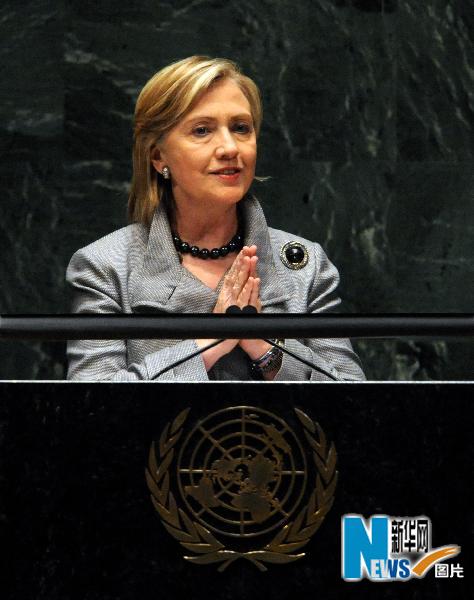 5月3日,在美國紐約聯(lián)合國總部,美國國務(wù)卿希拉里·克林頓在《不擴(kuò)散核武器條約》審議大會上發(fā)言。當(dāng)日,第八次《不擴(kuò)散核武器條約》審議大會在這里開幕。新華社記者申宏攝