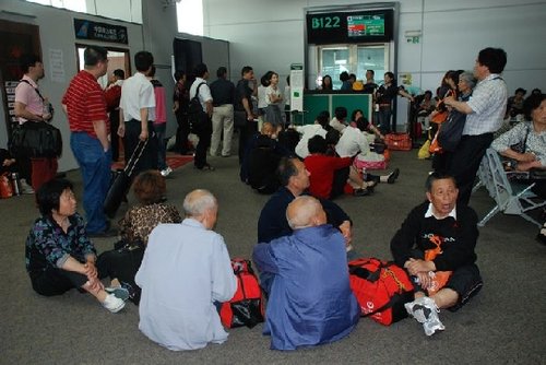 候機(jī)樓有點(diǎn)像難民營(yíng)。