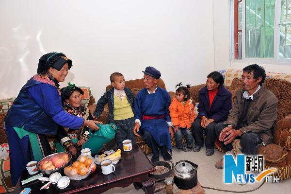 這是王富貴(中)和被救的三郎班卓(右二)丈夫王海清(右一)及楊志蘭(左二)祖孫三人在自己家聊天(5月8日攝)。 新華社記者 何俊昌 攝