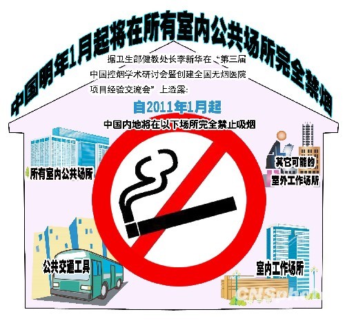 5月10日,衛(wèi)生部婦幼保健與社區(qū)衛(wèi)生司司長楊青在衛(wèi)生部例行新聞發(fā)布會上指出,根據(jù)世界衛(wèi)生組織《煙草控制框架公約》要求,自2011年1月起,我國應(yīng)當(dāng)在所有室內(nèi)公共場所、室內(nèi)工作場所、公共交通工具和其他可能的室外公共場所完全禁止吸煙。