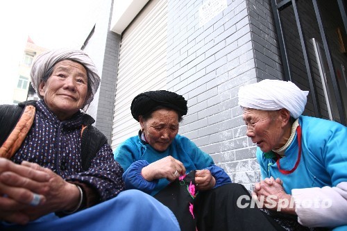 汶川地震兩周年臨近之際,在四川地震重災(zāi)區(qū),新修住房、城鎮(zhèn)巷子、老齡活動中心及景觀大道都已修建完畢。圖為汶川街道旁幾位老人閑聊,閑暇之時(shí)老人仍不忘繡”羌繡”。 中新社發(fā) 張浪 攝