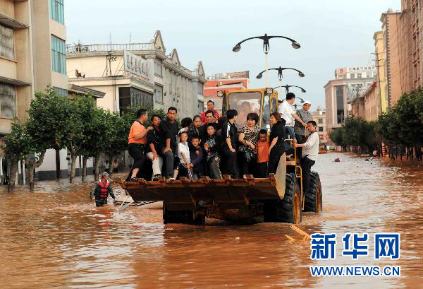 6月26日,受災(zāi)群眾坐在推土機(jī)上轉(zhuǎn)移。 新華社記者楊宗友攝
