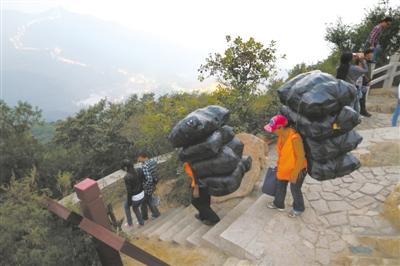 下午5時(shí)30分左右,太陽(yáng)落山,長(zhǎng)城上的游客陸續(xù)開始散去。此時(shí),清潔工們開始最后一次全面清理!八臉且陨蠜]有燈,天黑了就什么也看不見了,必須抓緊時(shí)間下山。”王化金說罷,便幫瘦弱的妻子背上3袋瓶子、1袋垃圾,自己背上了1袋瓶子和3袋垃圾。
