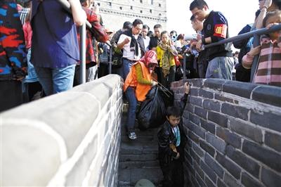 10月6日,黃金周第六天,北京八達(dá)嶺長(zhǎng)城景區(qū)累計(jì)游客人數(shù)達(dá)35.66萬(wàn)人,產(chǎn)生垃圾共計(jì)109噸。(新京報(bào)記者 周崗峰 攝影報(bào)道)