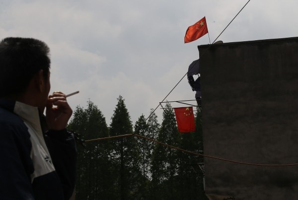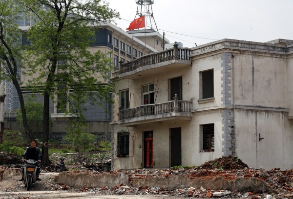 2015年4月20日,在安徽省合肥市銅陵南路與淝河路交口附近的一片拆遷地上,有多幢居民樓頂上插著五星紅旗,隨風(fēng)飄揚(yáng),格外引人注目。據(jù)一戶居民稱,他們?cè)谖蓓敳鍑?guó)旗是為了抗議暴力拆遷,“房子可以倒下,但五星紅旗不能倒!眻D為一幢居民樓屋頂上插著一面國(guó)旗和一面黨旗。