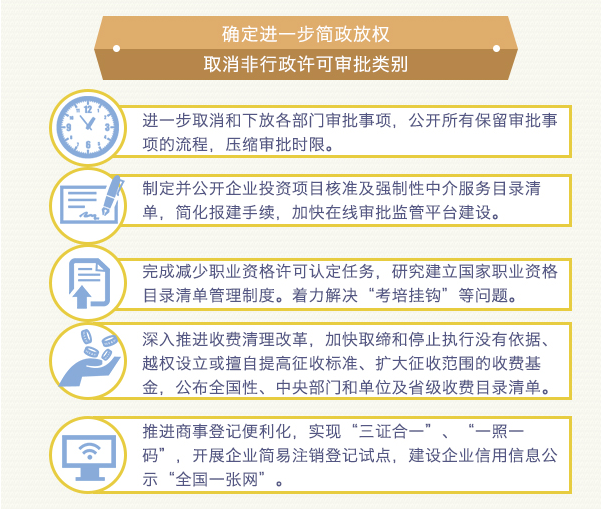 當(dāng)天的會(huì)議,確定進(jìn)一步簡(jiǎn)政放權(quán)、取消非行政許可審批類別,把改革推向縱深。李克強(qiáng)要求,各部門不能“放空炮”,更不能“糊弄了事”,要堅(jiān)決打破部門利益,保質(zhì)保量完成會(huì)議確定的各項(xiàng)任務(wù)。(李之南)圖據(jù)中國(guó)政府網(wǎng) 制圖 徐菁