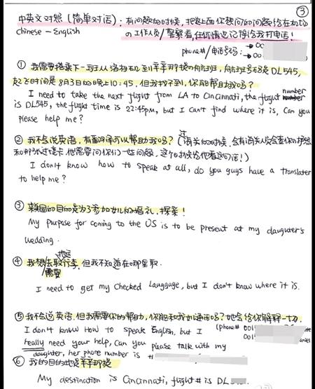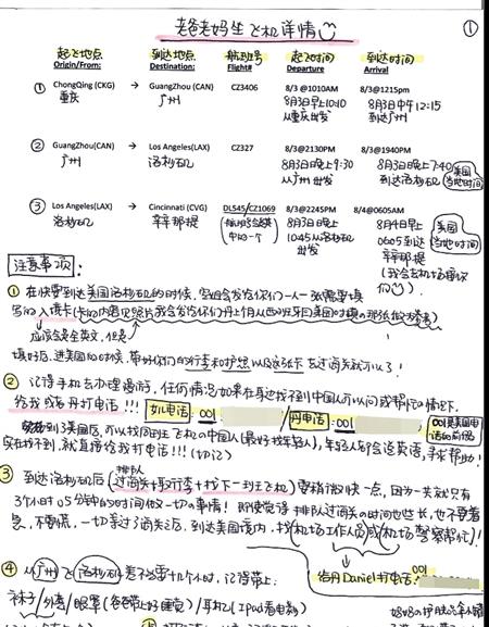 不懂英語,不熟悉路線,但內(nèi)心堅(jiān)定,那就是一定要搭乘國際航班去美國,參加女兒婚禮。出發(fā)在即,重慶巴南區(qū)的曹女士和丈夫卻擔(dān)憂起來:語言不通,轉(zhuǎn)機(jī)過程中會(huì)不會(huì)遇到麻煩?可是這份擔(dān)憂,做女兒的又豈能不知?于是,從大洋彼岸的美國,傳回一份長達(dá)3頁的手寫“坐飛機(jī)攻略”。女兒一筆一畫寫下的“攻略”,為父母掃去擔(dān)憂的同時(shí),還串起了遠(yuǎn)在異國的女兒與父母間濃濃的親情。