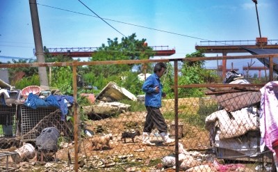 于從球的狗籠子大多不封頂,上面有一層很薄的黑紗布遮陽,地面溫度不低于40攝氏度,很多狗被熱得趴在地上一動不動。于從球的孫子和孫女平時(shí)就在這些黑紗布下的狗籠之間穿梭嬉戲。