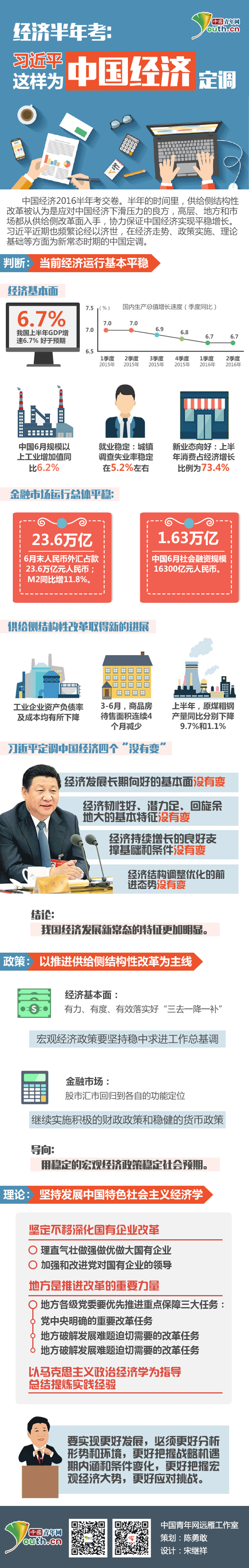 導(dǎo)語:2016年7月14日國家統(tǒng)計(jì)局公布中國經(jīng)濟(jì)半年數(shù)據(jù)。半年的時(shí)間里,供給側(cè)改革被認(rèn)為是應(yīng)對(duì)中國經(jīng)濟(jì)下滑壓力的良方。高層、地方和市場(chǎng)都從供給側(cè)改革面入手,協(xié)力共促中國經(jīng)濟(jì)實(shí)現(xiàn)平穩(wěn)快速增長(zhǎng)。習(xí)近平主席近期也頻繁論述經(jīng)濟(jì),在經(jīng)濟(jì)走勢(shì)、政策實(shí)施、理論基礎(chǔ)等方面為新常態(tài)下的中國經(jīng)濟(jì)定調(diào)。