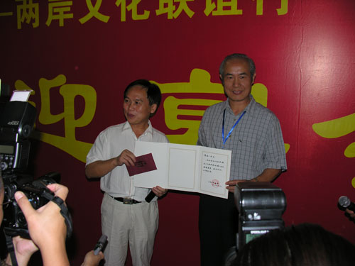 臺(tái)灣著名書(shū)法家陳坤一先生接過(guò)證書(shū)
