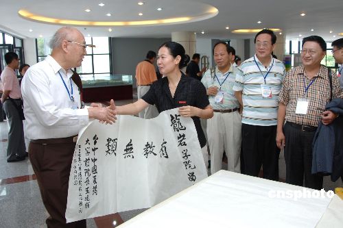 八月八日,臺(tái)灣客家文化專家學(xué)者參觀福建龍巖學(xué)院,臺(tái)灣中國醫(yī)藥大學(xué)前院長王廷輔(前排左一)參觀龍巖學(xué)院時(shí)書贈(zèng):“有教無類”。 中新社發(fā) 鄭祚聲 攝