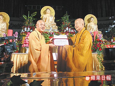 佛光山創(chuàng)辦人星云法師(右)致贈感謝狀給寒山寺住持秋爽法師。