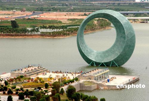 屹立于廈門園博園內(nèi)湖中央的三十六米高標(biāo)志性建筑“月光環(huán)”寓意“海上升明月,天涯共此時(shí)”,表達(dá)了兩岸人民共同期盼和平統(tǒng)一的心愿。 中新社發(fā) 王東明 攝