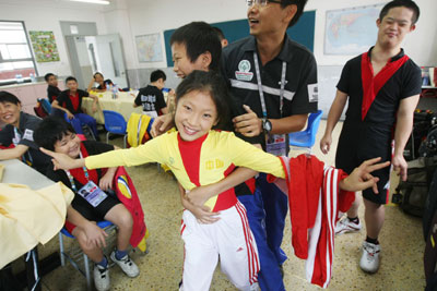 臺(tái)北特奧輪鞋選手黃泰龍(中排中)與大陸選手(前)交換徽章后熱情環(huán)抱。