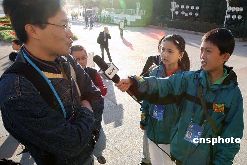 兩名中央電視臺特約小記者10月15日上午在北京人民大會堂采訪臺灣記者。中新社發(fā) 任晨鳴 攝