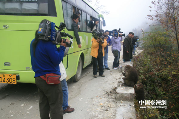 如果說冰川帶給記者們的是震撼,那么山間的靈猴帶給記者們的則是山水靈物帶來的驚喜。大巴車行至山間,一群調(diào)皮靈猴的出現(xiàn)讓記者們急忙喊停車。一剎那,獼猴成為了聚光燈下的焦點(diǎn)。臺(tái)灣東森電視臺(tái)的記者開玩笑道:“臺(tái)灣高雄也有這樣的猴子,但是很兇,會(huì)向人搶東西吃。這里的猴子很乖,他們會(huì)望著你、跟著你等你喂它!辈恢朗遣皇窍矚g上了這些臺(tái)灣記者,當(dāng)臺(tái)灣記者們要離開的時(shí)候,大家轉(zhuǎn)身發(fā)現(xiàn),獼猴們站成了一排,這似乎是在和他們告別,也似乎在期待著他們下一次的到來。