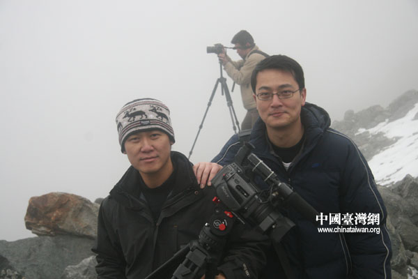 在貢嘎冰川上臺(tái)灣明視電視臺(tái)、臺(tái)灣TVBS電視臺(tái)的攝影師正在拍攝。(攝影:陳寧)