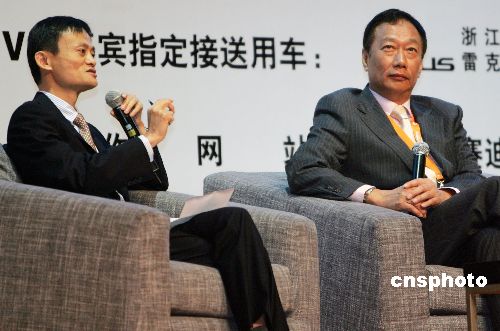 資料圖:臺(tái)灣鴻海集團(tuán)董事長(zhǎng)郭臺(tái)銘(右)與阿里巴巴董事局主席兼首席執(zhí)行官馬云在一起。 中新社發(fā) 任晨鳴 攝