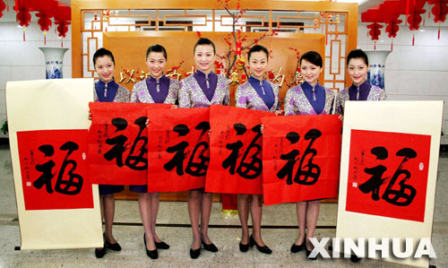 資料圖片:2006年1月24日,廈門航空公司的6名空姐展示“!弊。1月25日,2006年兩岸春節(jié)包機(jī)廈航首航班機(jī)抵達(dá)臺(tái)灣后,這些“!弊謱⒈毁(zèng)送給臺(tái)灣同行。新華社發(fā)(陳理杰 攝)