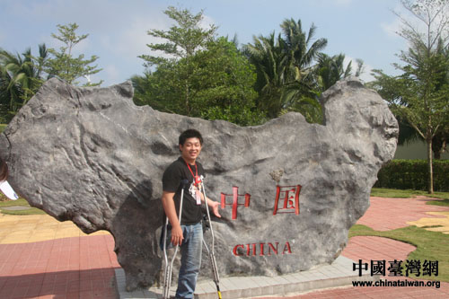 來(lái)自臺(tái)灣的營(yíng)員在中國(guó)大陸版圖的石雕前留影