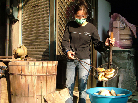 繼光餅一早開賣,通常上午八時至九時就賣完了,做餅的師傅前一天要先讓面團(tuán)發(fā)酵,最遲清晨五時要開始揉面。燒爐、貼爐要相當(dāng)技巧,只見高明中一邊解說,兩手不停地將面團(tuán)貼上高溫約攝氏四百度的爐子,分秒必爭,只因?yàn)闇囟炔粚α耍鎴F(tuán)就會掉到炭火里。