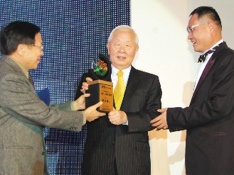 臺(tái)積電董事長張忠謀(中)獲全球華人企業(yè)領(lǐng)袖終身成就獎(jiǎng)。