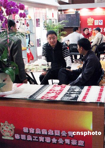 11月26日,由8家茶廠34位業(yè)者組成的云南普洱茶參展團(tuán),在臺(tái)北茗茶·咖啡暨美酒展上向臺(tái)灣采購商和民眾積極推介普洱茶,反響熱烈。這是云南普洱茶廠商第一次組團(tuán)來臺(tái)參展拓展市場(chǎng)。普洱茶具深厚的文化背景及豐富的茶性變化,有“云南產(chǎn)、香港賣、臺(tái)灣藏”之說,“越陳越香”的概念最早由臺(tái)灣收藏者炒作出來。為期4天的該展覽于當(dāng)日傍晚閉幕,720個(gè)攤位和400家廠商參展,規(guī)模居歷年之冠。中新社發(fā) 黃少華 攝