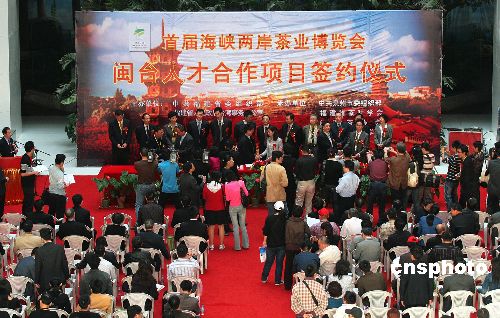 十一月十七日下午,“閩臺茶業(yè)人才合作共享機制簽約儀式”在中國閩臺緣博物館隆重舉行,共有一百多名海峽兩岸的專家學(xué)者參加了此次人才交流合作的三個余個簽約活動。 中新社發(fā) 傅丹丹 攝