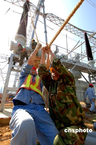 未來五年福建省電力公司將投資544億元人民幣打造海峽西岸堅強(qiáng)電網(wǎng),到2010年,500千伏電網(wǎng)將覆蓋全省所有地級市,形成全省大環(huán)網(wǎng)。圖為海峽西岸堅強(qiáng)電網(wǎng)的“龍頭”項(xiàng)目——500千伏東臺變電站施工現(xiàn)場,該變電站將于2006年底投產(chǎn)使用。 中新社發(fā) 王東明 攝