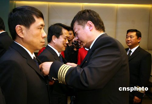 12月10日,四川航空集團公司繼兩年前在大陸首家引進8名臺籍飛行員后,再次引進12名臺籍飛行員。圖為川航負責人在第二批臺灣飛行員開飛儀式上,為他們佩戴飛行胸章和領帶。 中新社發(fā) 蔡超 攝