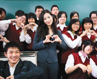 深圳航空臺灣籍空姐座艙長曾怡綸(中),昨天重返母;ㄉ徦木S高中,與學(xué)弟妹分享奮斗的故事,還用雙手比出愛心的手勢。(臺灣《聯(lián)合報》圖)