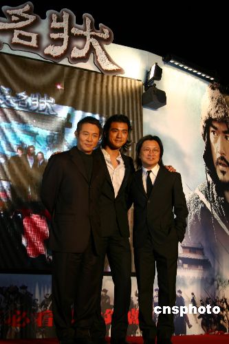 年底最矚目的華語大片《投名狀》十八日晚在臺北舉行了首映禮。導演陳可辛帶領(lǐng)片中明星李連杰、金城武等人參加首映會,并點燃禮花慶祝。中新社發(fā) 陳國華 攝
