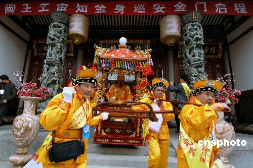 中新社福州一月八日電 (記者 黃翔)八日上午,福州蓮花山閩王紀念館舉行隆重的閩王金身巡安金門歡送儀式。閩王王審知金身巡安金門暨宗親文化交流訪問團一行七十余人,九日上午將護送閩王金身經(jīng)廈金航線首次巡安金門,進行為期四天的交流活動。