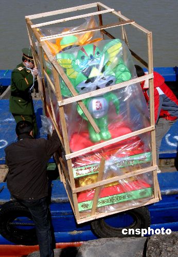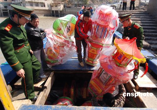 13日上午,象征“兩馬同春”的雙馬燈、喜氣洋洋的宮燈、走馬燈、手提燈,以及奧運福娃造型的花燈共900多盞,在連江縣黃岐港裝船運往馬祖(上圖),拉開了第六屆“兩馬同春鬧元宵”活動的序幕。