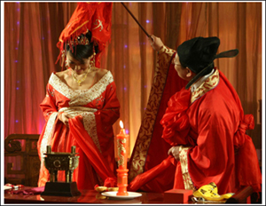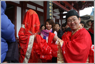 入鄉(xiāng)隨俗,一切按大唐婚典的儀式來操辦,“下馬射箭,驅(qū)邪安康!”司儀小郭高聲道。新郎下馬,彎弓搭箭,向雪中連射3箭。然后新郎來到花轎前,掀開紅布簾將新娘迎了出來,倆人手牽著紅綢緩緩步入婚禮的殿堂。新郎與新娘跨過象征著日子紅紅火火的“火盆”,接著司儀遞給新郎一桿代表稱心如意的秤,新郎用秤桿輕輕挑起新娘的紅蓋頭。美麗的新娘,讓樂得合不攏嘴的新郎,當(dāng)著上百親朋好友高聲連喊“滿意、滿意、滿意”!