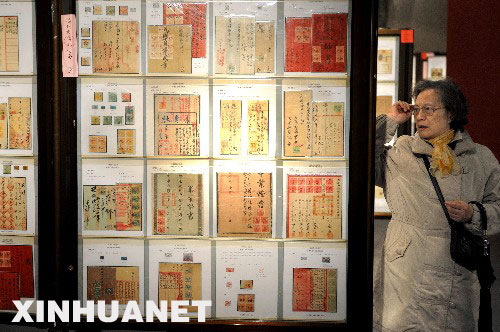 4月1日,一位福州市民在福建博物院參觀印花稅票郵展。當(dāng)日,首屆海峽兩岸及港澳印花稅票郵展在福建博物院舉行,展出來(lái)自海峽兩岸與香港、澳門等地的30多部、100多框展品。 新華社記者姜克紅攝