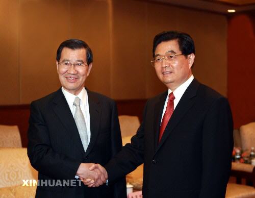 4月12日,中共中央總書記胡錦濤在海南省博鰲會(huì)見蕭萬長(zhǎng)先生率領(lǐng)的臺(tái)灣兩岸共同市場(chǎng)基金會(huì)代表團(tuán)一行。 新華社記者鞠鵬攝