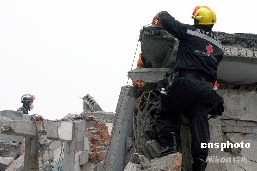 來(lái)自臺(tái)灣的紅十字救援隊(duì),十七日進(jìn)入四川綿竹市漢旺鎮(zhèn)展開(kāi)搜救工作,圖為隊(duì)員們爬上廢墟頂部探測(cè)。 中新社發(fā) 齊彬 攝
