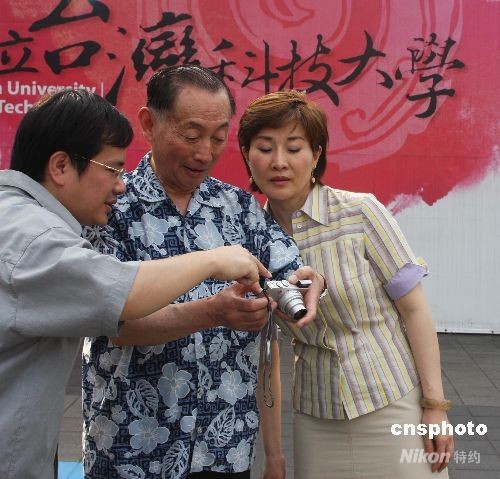 京劇大師梅蘭芳之子梅葆玖(中)第三次訪問臺灣,六月二十一日應邀由臺灣女弟子魏海敏(右)陪同在臺北科技大學演講。演講后,喜好攝影的梅先生拿出“萊卡”相機,請弟子欣賞自己拍攝的校園風景。 中新社發(fā) 耿軍 攝
