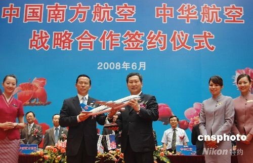 6月23日,在兩岸周末包機(jī)即將開啟之際,大陸最大的航空公司中國(guó)南方航空公司與臺(tái)灣最大的航空公司中華航空公司在廣州簽署戰(zhàn)略合作備忘錄,并宣布為兩岸同胞提供更便利、更優(yōu)質(zhì)的周末包機(jī)服務(wù)。圖為南航董事長(zhǎng)劉紹勇(左二)與華航董事長(zhǎng)趙國(guó)帥(左三)簽署備忘錄并互贈(zèng)紀(jì)念品。 中新社發(fā) 柯小軍 攝