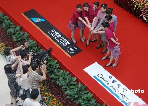6月23日,在兩岸周末包機(jī)即將開啟之際,大陸最大的航空公司中國(guó)南方航空公司與臺(tái)灣最大的航空公司中華航空公司在廣州簽署戰(zhàn)略合作備忘錄,并宣布為兩岸同胞提供更便利、更優(yōu)質(zhì)的周末包機(jī)服務(wù)。圖為兩家航空公司的空姐攜起手來,以示將為兩岸同胞提供更優(yōu)質(zhì)的服務(wù)。 中新社發(fā) 柯小軍 攝