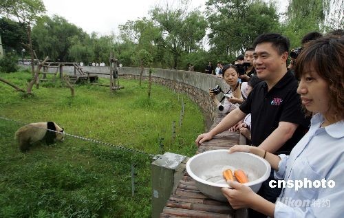 6月25日上午,臺北市長郝龍斌一行到上海野生動物園,看望大熊貓和金絲猴。郝龍斌希望上海的大熊貓和金絲猴能落戶臺北,此外臺北的紅毛猩猩、白毛長臂猿能到上海。他認為,珍惜的野生動物能在異地落戶生存,有利于生態(tài)。 中新社發(fā) 潘索菲 攝
