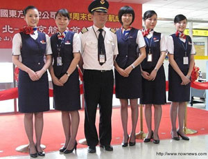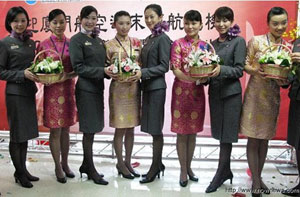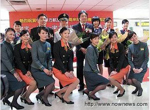 廈門航空的空姐相當特殊地穿著一身改良式的短裙旗袍,顯得特別亮眼。東方航空隨機的5位空姐,其中經(jīng)常出現(xiàn)于東航宣傳片中的鄭相君,此次歷史性的首航再度現(xiàn)身于臺北。每回東航重要的包機任務,總會指派鄭相君,上次國民黨主席吳伯雄走訪大陸,所搭乘的東航包機,就曾隨機服務,而今天吳伯雄也特別出席東航首航的儀式,再度相逢。