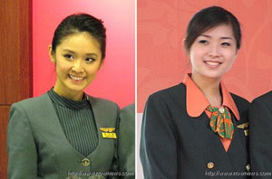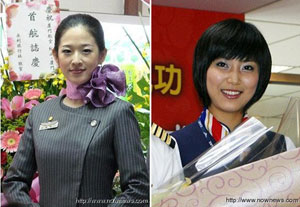 圖左:復興航空酷似大陸影星章子怡的空姐;圖右:東方航空樣板空服員鄭相君。臺灣東森新聞記者黃志偉攝