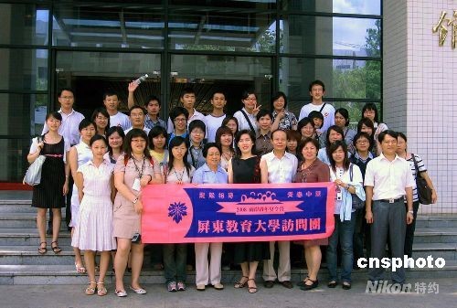 七月六日,?,臺(tái)灣屏東教育大學(xué)三十六位師生來瓊第二日,與一道參加全國(guó)臺(tái)聯(lián)“二00八年臺(tái)胞青年千人夏令營(yíng)”海南分營(yíng)的海南師范大學(xué)學(xué)生們,在海南師范大學(xué)圖書館前留影。 中新社發(fā) 葉霖嘉 攝
