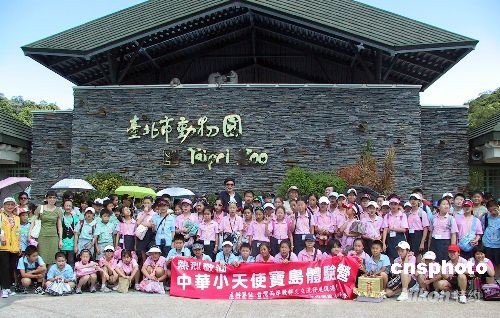 來自北京中關(guān)村第三小學的近百位“中華小天使”七月十五日在臺灣展開寶島夏令營行程,創(chuàng)下兩岸兒童交流人數(shù)最多的紀錄。此次來臺的小朋友平均年齡在十一歲左右,由十六位老師帶領(lǐng),他們于十四日抵達臺灣,在臺行程九天八夜。圖為在參觀臺北市立動物園前合影。 中新社發(fā) 徐長安 攝