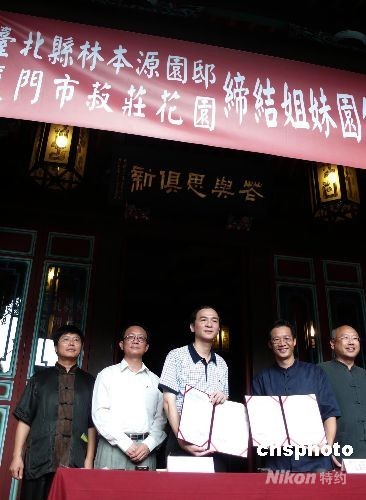 中新社臺北七月三十一日電 (記者 曾嘉 董會峰)廈門市菽莊花園與臺北縣林本源園邸(俗稱“林家花園”)三十一日在此間締結“姊妹園”,兩園將建立長期穩(wěn)定交流機制,開展文化旅游交流合作。