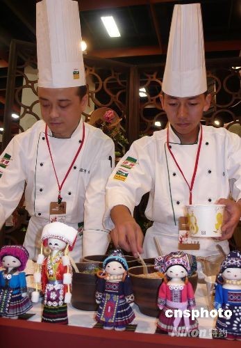 “二00八臺灣美食展”八月十五日在臺北開幕。來自貴州的黔菜展區(qū),展示了貴州菜“絲娃娃”、苗家酸魚湯等十二道菜,貴州師傅徐靜松、袁平還現(xiàn)場示范制作紅油米豆腐、糕粑稀飯,讓觀眾見識辣、酸、鮮、野的黔菜風(fēng)味。 中新社發(fā) 曾嘉 攝