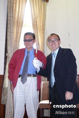 臺灣知名學者李敖與大陸知名地產(chǎn)商潘石屹十八日在臺北舉行對談活動,吸引媒體采訪。圖為對談結(jié)束后,潘石屹贈送李敖北京奧運祥云火炬紀念品。 中新社發(fā) 曾嘉 攝