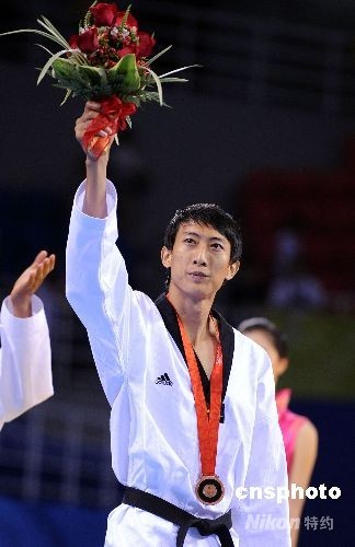 8月20日,北京奧運(yùn)會跆拳道賽,中華臺北隊朱木炎在男子58公斤以下級銅牌賽中擊敗泰國對手,獲銅牌。這是中華臺北隊繼兩面舉重獎牌后的第三塊獎牌。 中新社發(fā) CNAsports 攝